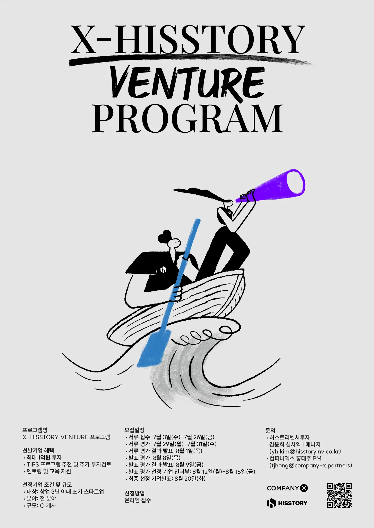 히스토리벤처투자와 컴퍼니엑스가 함께 유망한 스타트업을 발굴하고 투자하기 위해 ‘X-HISSTORY VENTURE PROGRAM’을 개최한다. 이번 배치 프로그램은 창업 3년 이내의 초기 스타트업을 대상으로 하며, 인큐베이팅과 멘토링, 최대 1억원의 투자와 TIPS 프로그램 추천을 통해 스타트업의 성장을 지원할 계획이다.