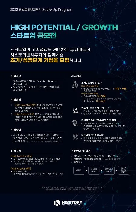참여를 희망하는 스타트업은 히스토리벤처투자 홈페이지 및 k-startup, 넥스트 유니콘, the vc 등의 플랫폼을 통해 서류를 접수할 수 있다.